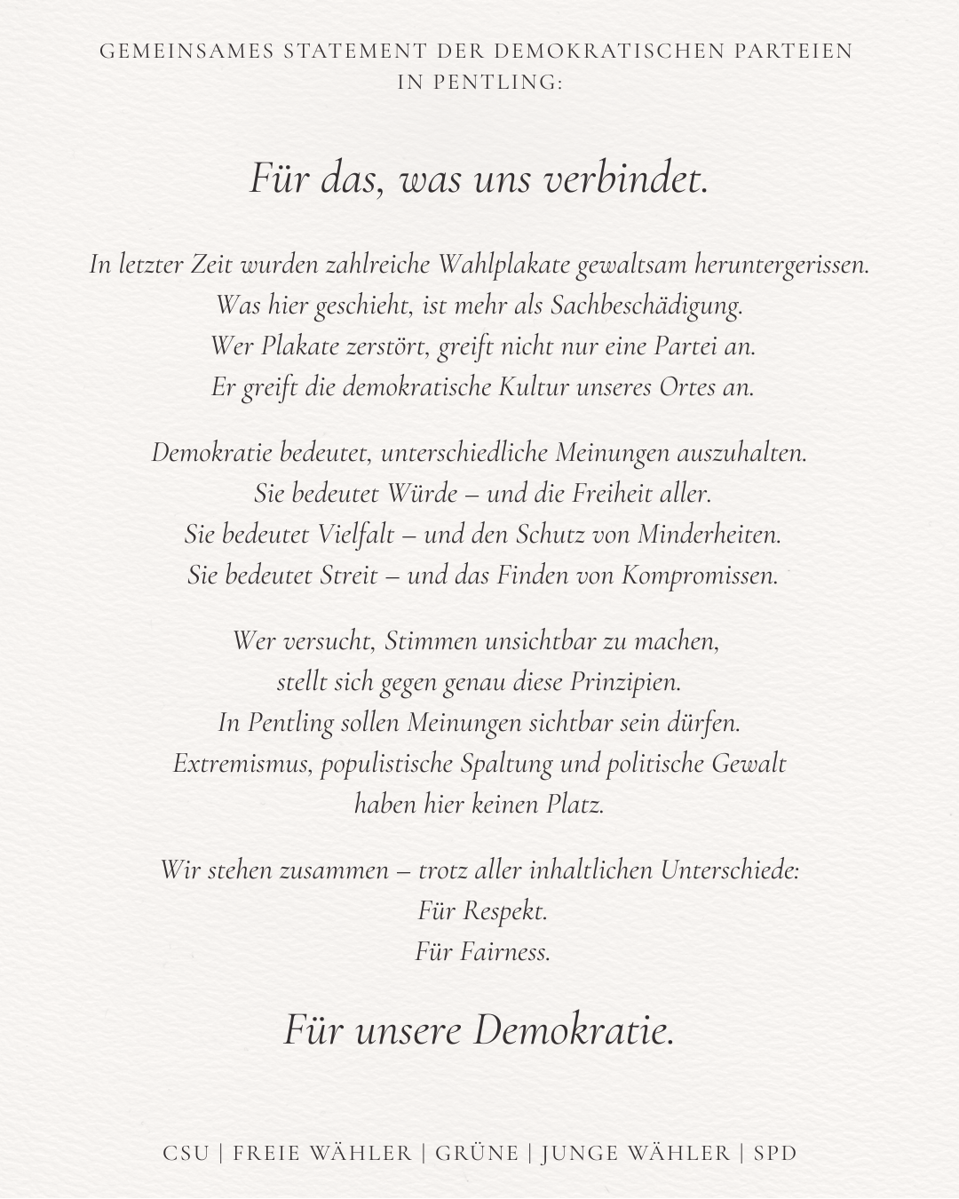 Unser gemeinsames Ziel bleibt unverändert: Wir wollen uns weiterhin für Klimaschutz, Bürgerbeteiligung, gerechte Mobilität, den Schutz unserer natürlichen Lebensgrundlagen und eine moderne, transparente Gemeindepolitik einsetzen. Gemeinsam arbeiten wir daran, Pentling und seine Ortsteile nachhaltig, lebenswert und zukunftsfähig zu gestalten.